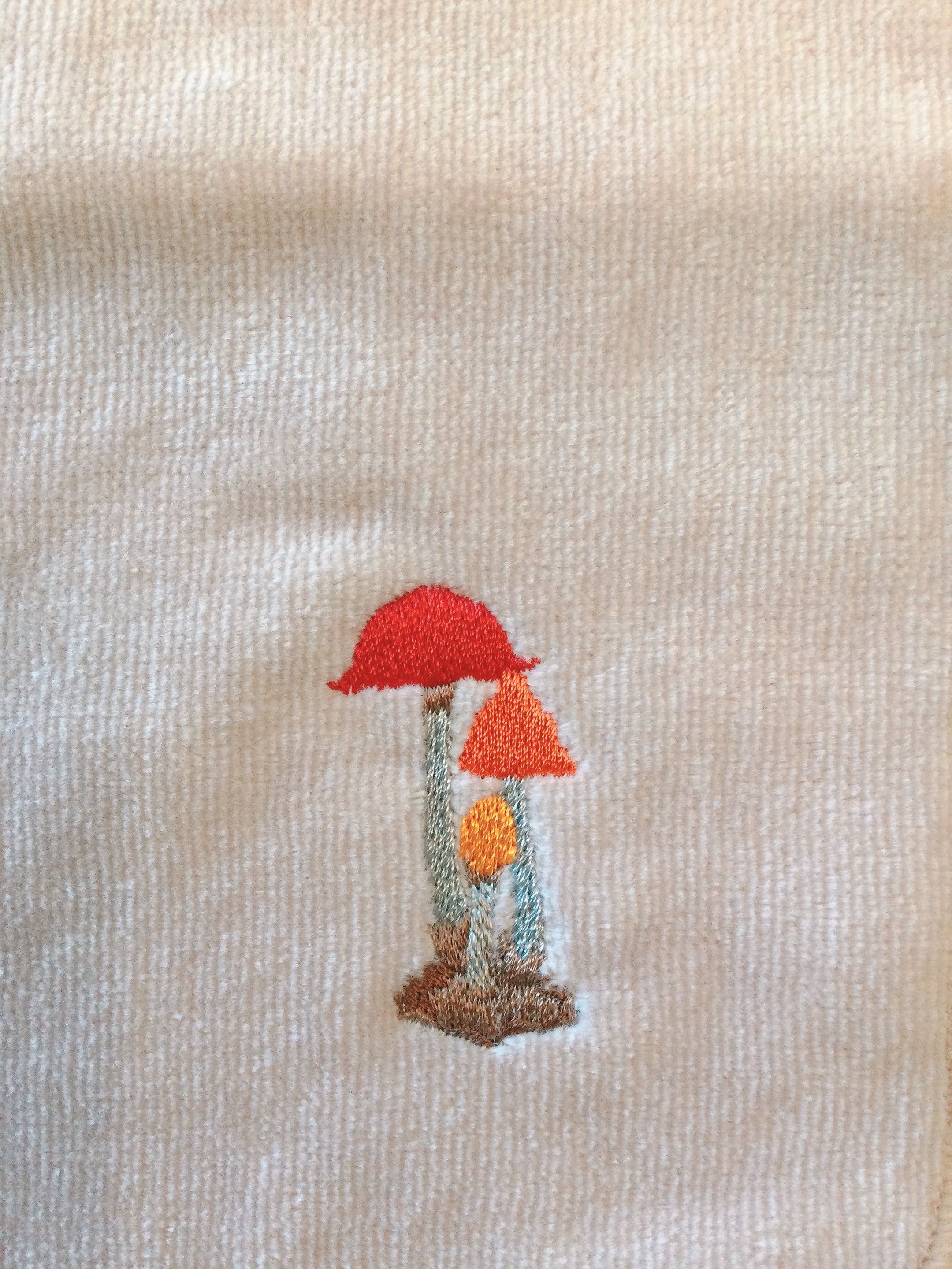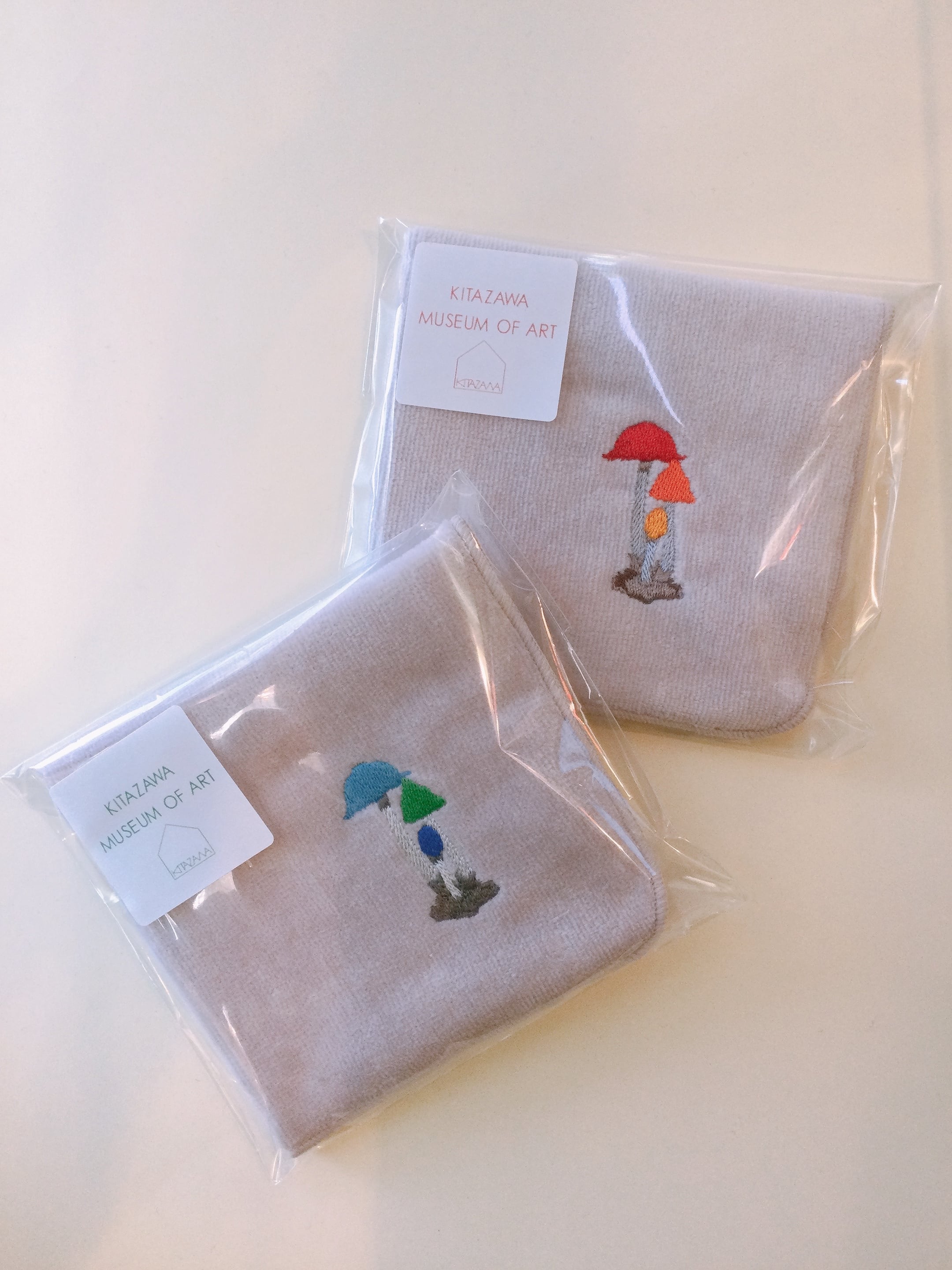 当館代表作「ひとよ茸ランプ」の刺繍をあしらったタオルハンカチ♪柔らかい手触りで使い心地抜群です♪